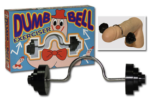 Silberfarbene Mini-Hantel mit schwarzen Kunststoff-Gewichten und Einbuchtung für Ihren Penis. Ca. 12 cm lang.